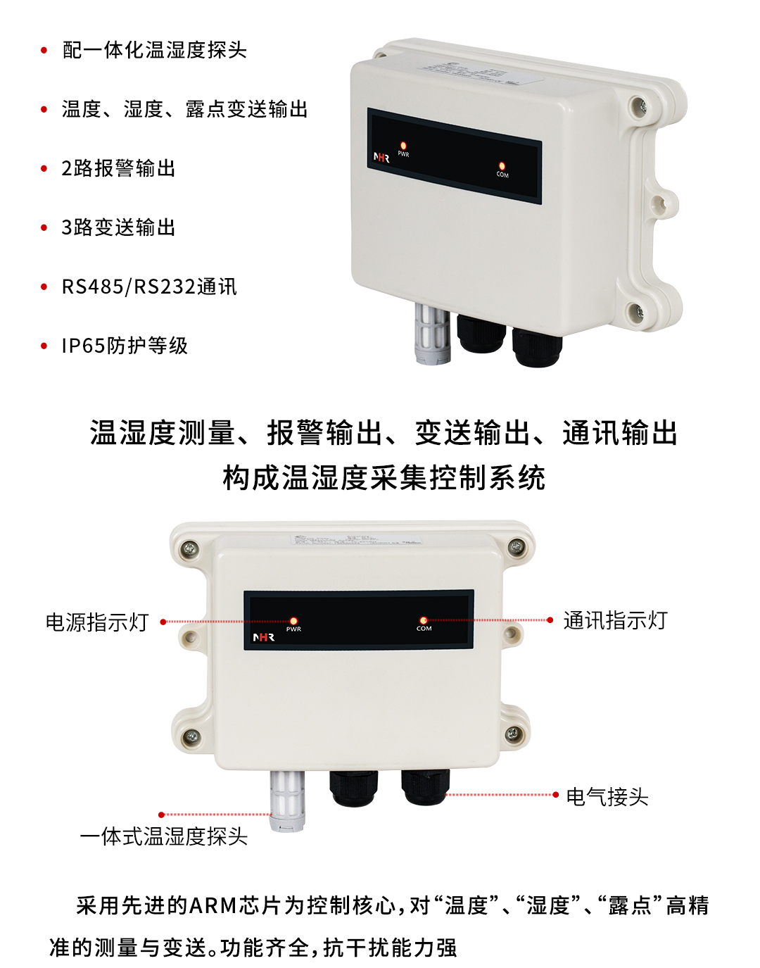 虹潤(rùn)公司是專業(yè)生產(chǎn)環(huán)境監(jiān)測(cè)儀表的國(guó)家專精特新“小巨人”企業(yè)。生產(chǎn)的一體式溫濕度變送器,具有溫度、濕度、露點(diǎn)高精準(zhǔn)的測(cè)量與變送,報(bào)警繼電器輸出,RS485/RS232通訊,IP65防護(hù)等級(jí)等特點(diǎn)。產(chǎn)品獲得一種手持式低功耗溫濕度檢測(cè)儀、大屏幕溫濕度記錄儀等2項(xiàng)國(guó)家發(fā)明專利,主持起草物聯(lián)網(wǎng)智能溫度儀表通用技術(shù)條件、冷鏈溫度記錄儀等2項(xiàng)國(guó)家標(biāo)準(zhǔn),以及通信系統(tǒng)多通道數(shù)據(jù)采集控制終端規(guī)范軍用標(biāo)準(zhǔn),以及現(xiàn)場(chǎng)設(shè)備集成等5項(xiàng)智能制造國(guó)家標(biāo)準(zhǔn),參與國(guó)際5G標(biāo)準(zhǔn)制定,取得溫濕度儀表等3項(xiàng)相關(guān)軟件著作權(quán)。產(chǎn)品廣泛應(yīng)用于工業(yè)現(xiàn)場(chǎng)、農(nóng)業(yè)大棚、倉(cāng)儲(chǔ)物流、地下管廊、養(yǎng)殖孵化、配電機(jī)房等諸多領(lǐng)域。