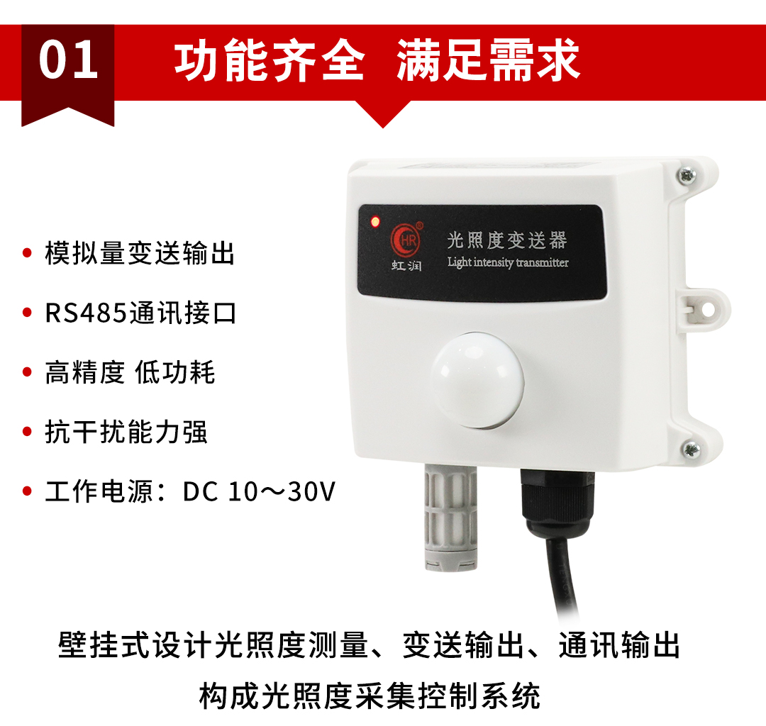 虹潤公司是專業(yè)生產環(huán)境監(jiān)測儀表的國家專精特新“小巨人”企業(yè)。生產的光照度變送器,具有高精度感光傳感器,響應靈敏,準確度高,低功耗,模擬量變送輸出或RS485通訊等特點。產品獲得一種農業(yè)監(jiān)控變送器、一種儀表電源等2項實用新型專利,主持起草現場設備集成等5項智能制造國家標準,以及現場設備工具(FDT)接口規(guī)范、物聯網總體技術智能傳感器特性與分類等2項國家標準,參與國際5G標準制定,取得農業(yè)監(jiān)測變送器等3項相關軟件著作權。產品廣泛應用于溫室大棚、花卉養(yǎng)殖、科研實驗、智能樓宇、戶外照明等環(huán)境場合對光照度的檢測。