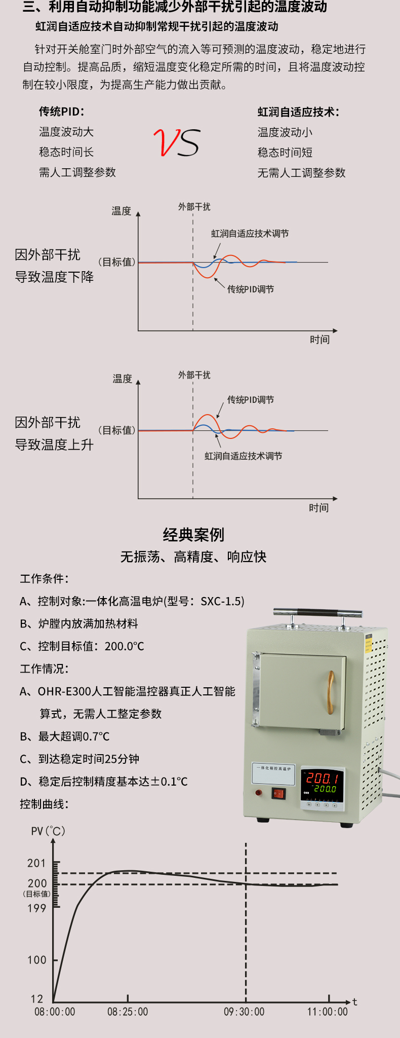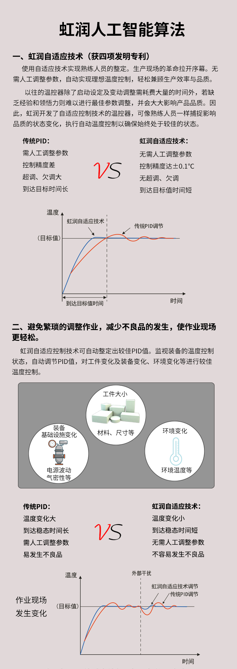 虹潤公司是專業(yè)生產(chǎn)溫控器的國家專精特新“小巨人”企業(yè)。生產(chǎn)的人工智能溫控器,具有真正人工智能算式,無需人工整定參數(shù),控制精度可達(dá)±0.1°C,多種輸出類型,高抗干擾等特點。產(chǎn)品獲得模糊PID控制儀及控制方法、人工智能調(diào)節(jié)器、智能化控制器、移相觸發(fā)控制器、閥門自動手動無擾動操作控制方法及裝置等5項國家發(fā)明專利,主持起草工業(yè)過程控制系統(tǒng)用模擬輸入兩位或多位輸出儀表、物聯(lián)網(wǎng)智能溫度儀表通用技術(shù)條件、工業(yè)過程測量和控制系統(tǒng)用智能調(diào)節(jié)器等3項國家標(biāo)準(zhǔn),以及通信系統(tǒng)多通道數(shù)據(jù)采集控制終端規(guī)范軍用標(biāo)準(zhǔn),參與國際5G標(biāo)準(zhǔn)制定,取得模糊PID溫控儀等3項相關(guān)軟件著作權(quán)。產(chǎn)品廣泛應(yīng)用于電力、石化,冶金、制藥、食品等幾乎所有工業(yè)現(xiàn)場,實現(xiàn)精準(zhǔn)控溫,保障生產(chǎn)安全與質(zhì)量。