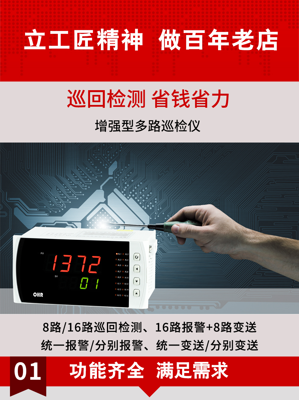 虹潤公司是專業(yè)生產(chǎn)多路溫度巡檢儀的國家專精特新“小巨人”企業(yè),生產(chǎn)的增強(qiáng)型多路巡檢儀,具有8路/16路測量通道,全切換信號輸入,多種輸出類型,高抗干擾,RS485/RS232通訊等特點(diǎn)。產(chǎn)品獲得巡回檢測顯示方法及裝置、儀表殼體等2項(xiàng)國家發(fā)明專利,主持起草工業(yè)過程控制系統(tǒng)用模擬輸入兩位或多位輸出儀表、物聯(lián)網(wǎng)智能溫度儀表通用技術(shù)條件等2項(xiàng)國家標(biāo)準(zhǔn),以及通信系統(tǒng)多通道數(shù)據(jù)采集控制終端規(guī)范軍用標(biāo)準(zhǔn),參與國際5G標(biāo)準(zhǔn)制定,取得多回路測量顯示控制儀等3項(xiàng)相關(guān)軟件著作權(quán)。產(chǎn)品廣泛應(yīng)用于電力、石化、冶金、制藥、水處理、機(jī)械配套等各種工業(yè)現(xiàn)場。