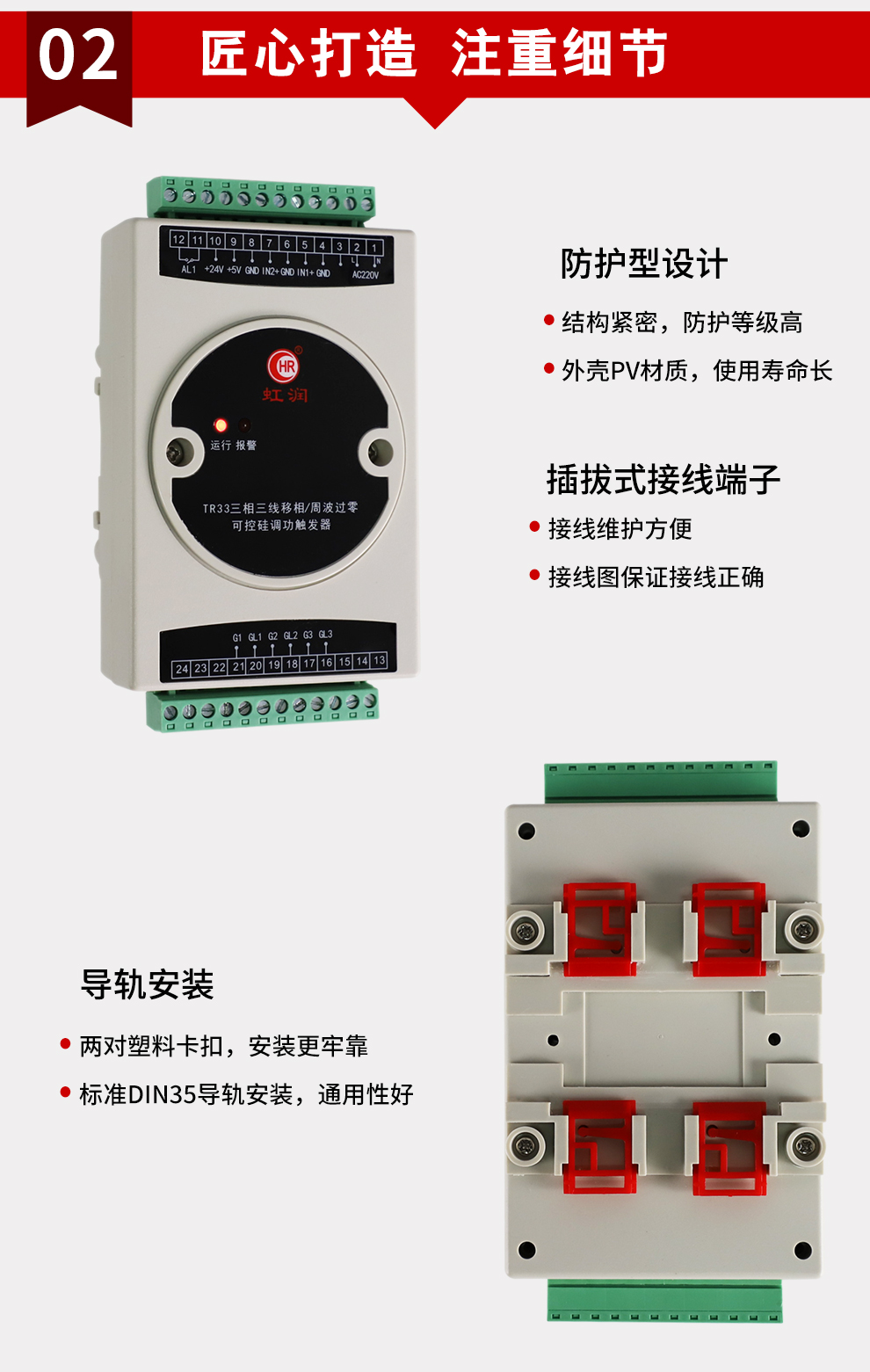 虹潤公司是專業(yè)生產(chǎn)移相觸發(fā)器的國家專精特新“小巨人”企業(yè),生產(chǎn)的移相觸發(fā)器,具有采用光電隔離設計,自動同步功能,過流保護技術(shù),電源缺相檢測,信號超限報警等特點。產(chǎn)品獲得巡回檢測顯示方法及裝置、儀表殼體等2項國家發(fā)明專利,主持起草工業(yè)過程控制系統(tǒng)用模擬輸入兩位或多位輸出儀表、物聯(lián)網(wǎng)智能溫度儀表通用技術(shù)條件等2項國家標準以及通信系統(tǒng)多通道數(shù)據(jù)采集控制終端規(guī)范軍用標準,參與國際5G標準制定,取得外置移相觸發(fā)器等2項相關(guān)軟件著作權(quán)。產(chǎn)品廣泛應用于工業(yè)溫控、電極控制、航天軍工、電爐溫控、食品醫(yī)藥等諸多領(lǐng)域。