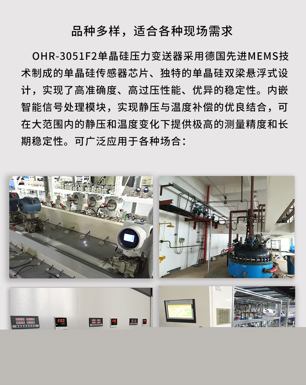 虹潤公司是專業(yè)生產(chǎn)壓力變送器的國家專精特新“小巨人”企業(yè),生產(chǎn)的單晶硅壓力變送器,具有高精度,小溫漂,性能穩(wěn)定,帶HART通訊,抗干擾能力強(qiáng),自診斷功能等特點(diǎn)。產(chǎn)品獲得一種數(shù)字顯示低功耗壓力表、一種信號發(fā)生器裝置等2項(xiàng)國家發(fā)明專利,主持起草工業(yè)過程控制系統(tǒng)用模擬輸入兩位或多位輸出儀表、工業(yè)過程測量和控制系統(tǒng)用壓力/差壓變送器等2項(xiàng)國家標(biāo)準(zhǔn),通信系統(tǒng)多通道數(shù)據(jù)采集控制終端規(guī)范軍用標(biāo)準(zhǔn),以及現(xiàn)場設(shè)備集成等5項(xiàng)智能制造國家標(biāo)準(zhǔn)。參與國際5G標(biāo)準(zhǔn)制定,取得數(shù)顯壓力表等2項(xiàng)相關(guān)軟件著作權(quán)。產(chǎn)品廣泛應(yīng)用于化工、食品、制藥、電力、設(shè)備配套、供暖、水處理、樓宇等行業(yè),需精準(zhǔn)測量流體壓力的現(xiàn)場。