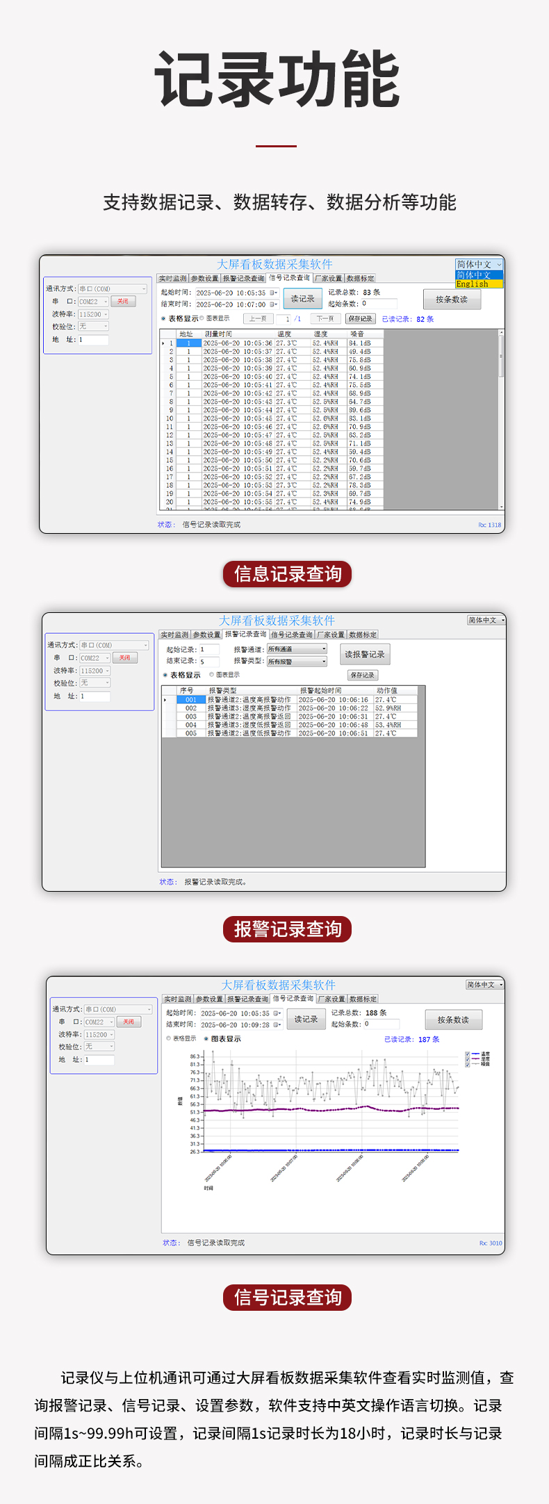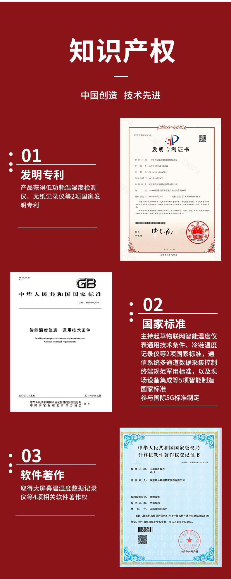 虹潤公司是專業(yè)生產(chǎn)環(huán)境監(jiān)測儀表的國家專精特新“小巨人”企業(yè)。生產(chǎn)的大屏噪音溫濕度記錄儀,具有高清大屏顯示,數(shù)據(jù)記錄與轉(zhuǎn)存,同步觸發(fā)可靠預(yù)警,RS485或以太網(wǎng)通訊等特點。產(chǎn)品獲得一種手持式低功耗溫濕度檢測儀、無紙記錄儀等2項國家發(fā)明專利,主持起草物聯(lián)網(wǎng)智能溫度儀表通用技術(shù)條件、冷鏈溫度記錄儀等2項國家標(biāo)準(zhǔn),通信系統(tǒng)多通道數(shù)據(jù)采集控制終端規(guī)范軍用標(biāo)準(zhǔn),以及現(xiàn)場設(shè)備集成等5項智能制造國家標(biāo)準(zhǔn),參與國際5G標(biāo)準(zhǔn)制定,取得大屏幕溫濕度數(shù)據(jù)記錄儀等3項相關(guān)軟件著作權(quán)。產(chǎn)品廣泛應(yīng)用于電子制造、醫(yī)療科研、倉儲管理、畜牧養(yǎng)殖、建筑工程等諸多領(lǐng)域。