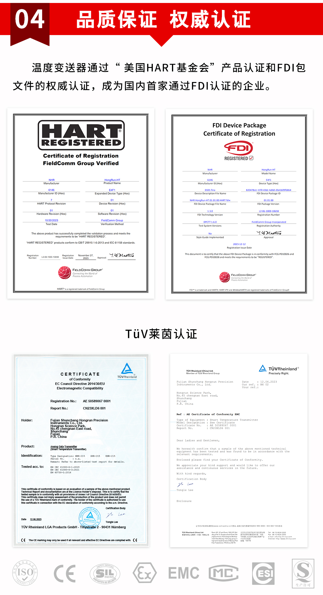 虹潤公司是專業(yè)生產(chǎn)溫度變送器的國家專精特新“小巨人”企業(yè)。生產(chǎn)的智能溫度變送器,具有適配各類溫度傳感器,精度高,通過編程線修改輸入信號類型及量程,高抗干擾,HART或485通訊等特點(diǎn)。該產(chǎn)品不僅通過HART基金會認(rèn)證、德國萊茵 CE 認(rèn)證與 SIL 功能安全認(rèn)證,還獲得具備減震抗干擾能力的溫度變送器、信號隔離器、一種二端子模塊、無源信號隔離器等4項(xiàng)國家發(fā)明專利,主持起草物聯(lián)網(wǎng)智能溫度儀表、現(xiàn)場設(shè)備工具(FDT)接口規(guī)范、工業(yè)過程測量和控制系統(tǒng)用溫度變送器等3項(xiàng)國家標(biāo)準(zhǔn),以及通信系統(tǒng)多通道數(shù)據(jù)采集控制終端規(guī)范軍用標(biāo)準(zhǔn),參與國際5G標(biāo)準(zhǔn)制定,取得HART溫度變送器、智能溫度變送器等3項(xiàng)相關(guān)軟件著作權(quán)。產(chǎn)品廣泛應(yīng)用于石油、化工、電力、冶金、制藥、食品、水處理等各種工業(yè)領(lǐng)域。