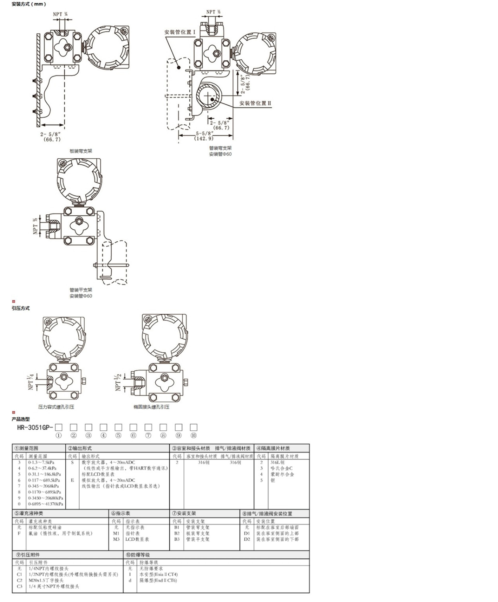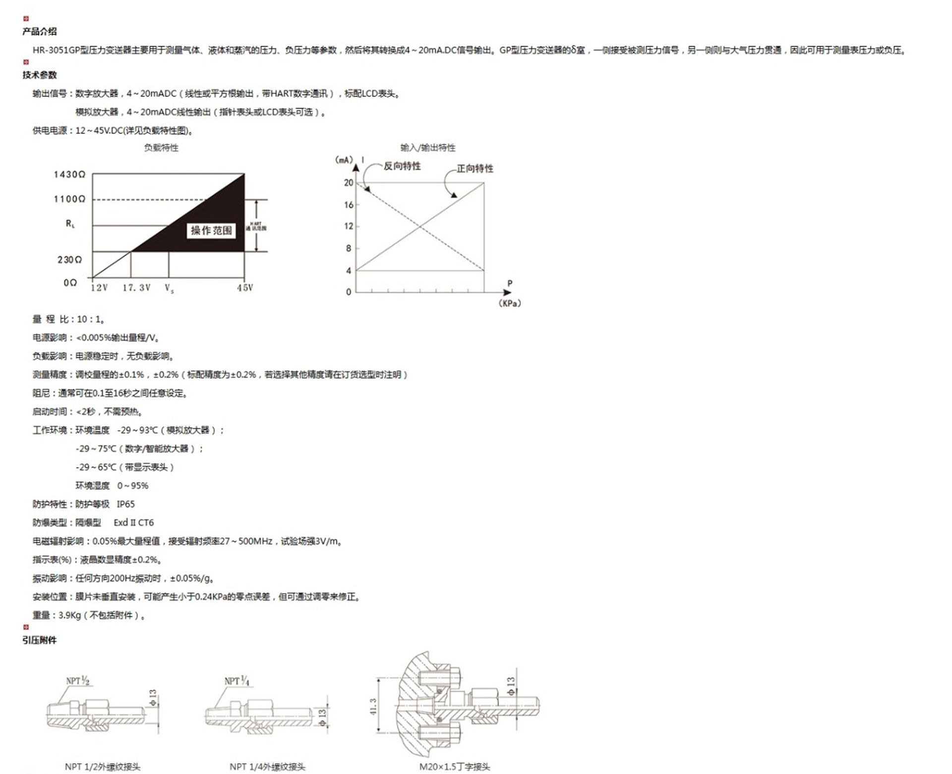HR-3051GP型壓力變送器主要用于測量氣體、液體和蒸汽的壓力、負壓力等參數,然后將其轉換成4~20mA.DC信號輸出。GP型壓力變送器的δ室,一側接受被測壓力信號,另一側則與大氣壓力貫通,因此可用于測量表壓力或負壓。