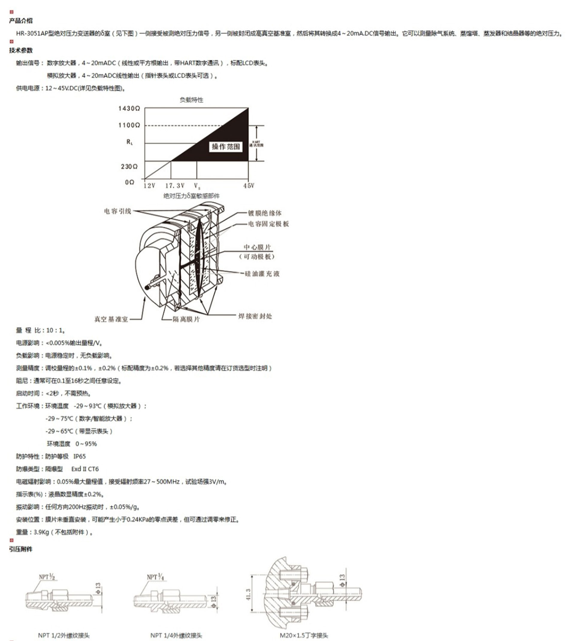 HR-3051AP型絕對(duì)壓力變送器的δ室(見(jiàn)下圖)一側(cè)接受被測(cè)絕對(duì)壓力信號(hào),另一側(cè)被封閉成高真空基準(zhǔn)室,然后將其轉(zhuǎn)換成4~20mA.DC信號(hào)輸出。它可以測(cè)量除氣系統(tǒng)、蒸餾塔、蒸發(fā)器和結(jié)晶器等的絕對(duì)壓力。